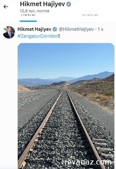 Помощник президента Азербайджана - заведующий отделом по вопросам внешней политики Администрации президента Хикмет Гаджиев поделился фотографией с надписью "Зангезурский коридор".Гаджиев разместил публикацию на своей странице в социальной сети X.